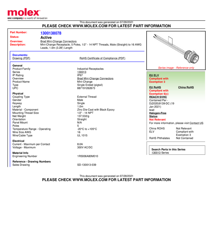 1300138078 Molex 1300138078 Złącze konfekcjonowane czujnika/aktuatora Molex WOD In...