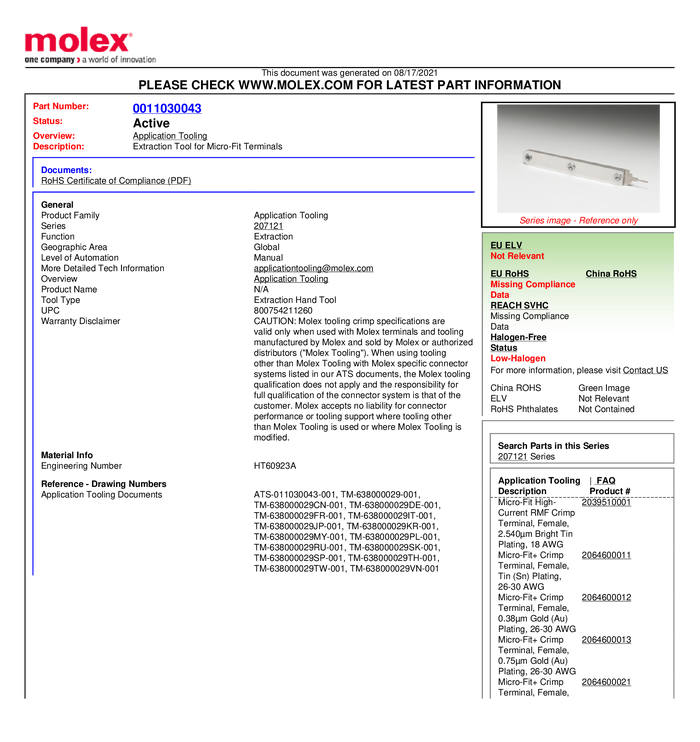 11030043 Narzędzie do ekstrakcji Molex MOL Power & Signal Sol. 11030043 Molex Za...