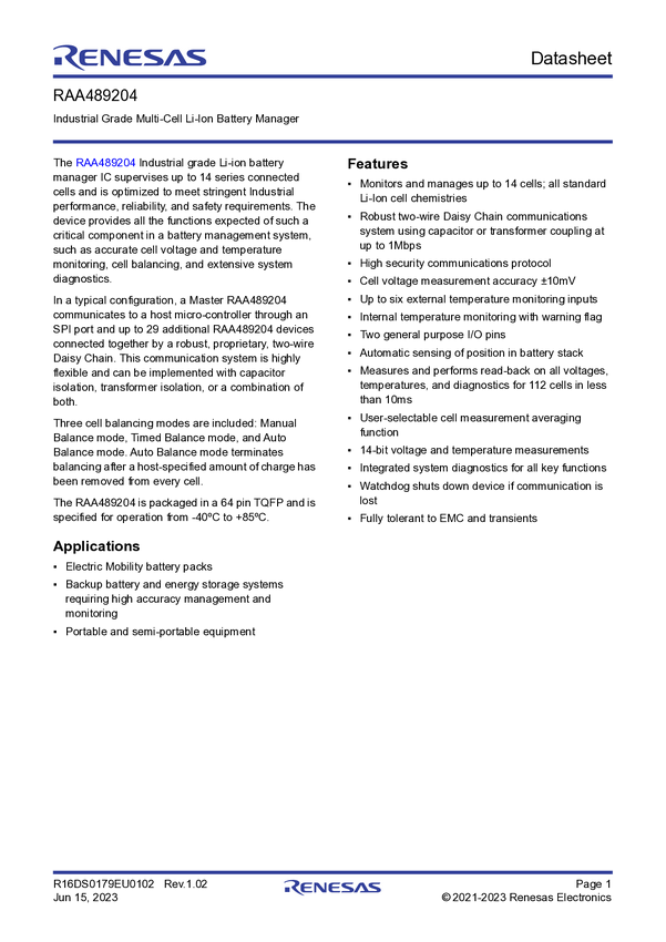 RAA489204 Multi-Cell Daisy-Chainable Li-Ion Battery Manager