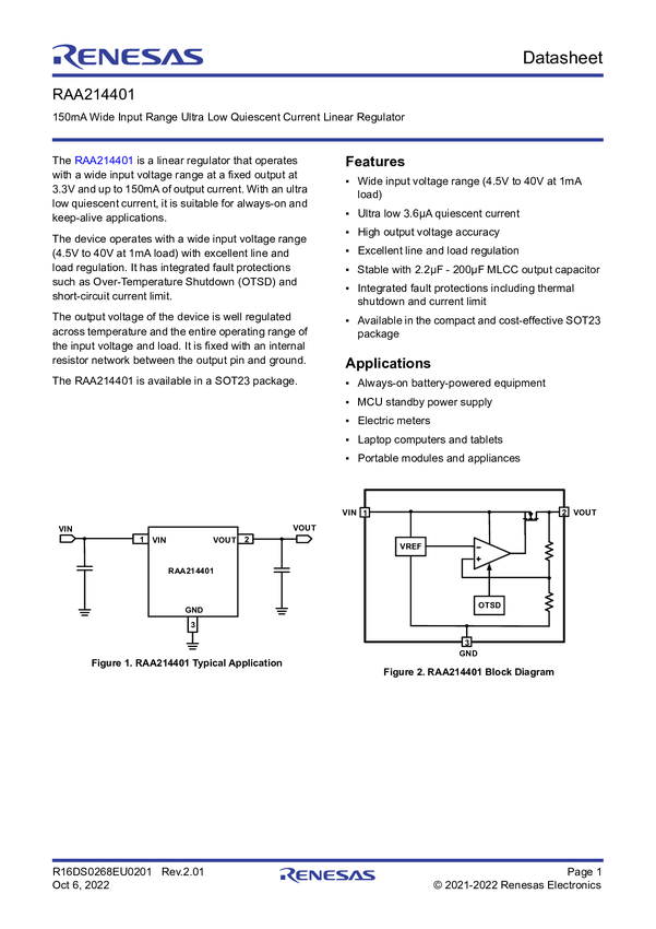 RAA214401 150mA Wide Input Range Ultra-Low Quiescent Current Linear Regulator