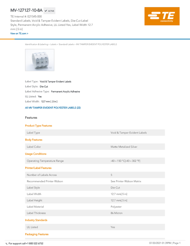 E21545-000 TE Connectivity E21545-000 TE RAY Labels - Standard