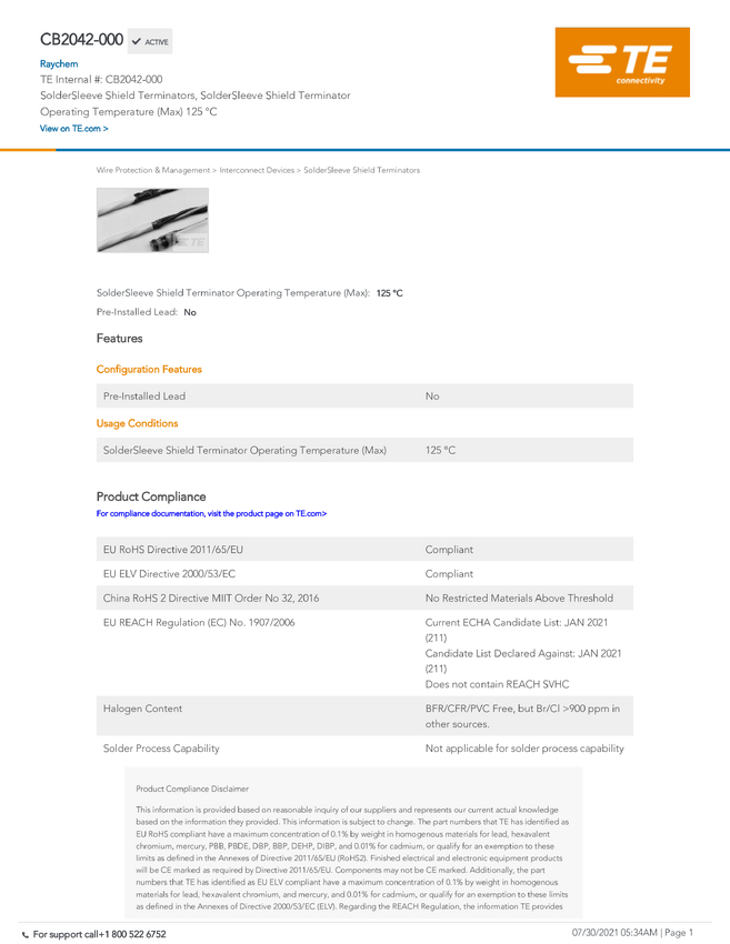 CB2042-000 TE Connectivity CB2042-000 TE RAY Solder Sleeves, 1 szt.