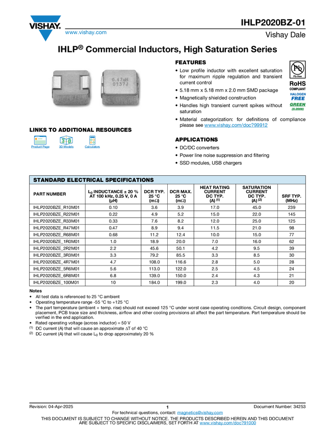 IHLP2020BZ-01 IHLP® Commercial Inductors, High Saturation Series