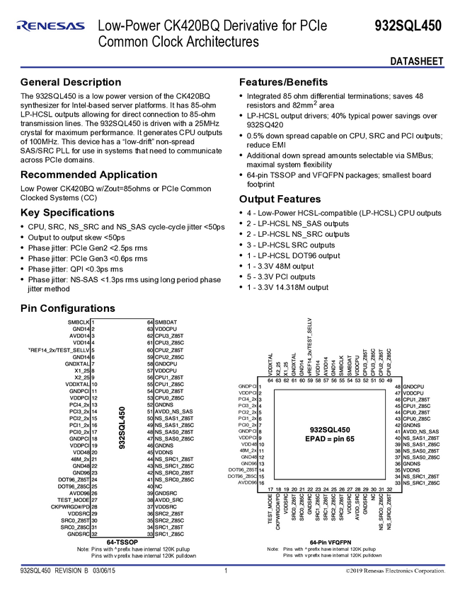 932SQL450BGLF Low-Power CK420BQ Derivative for PCIe Common Clock Architectures