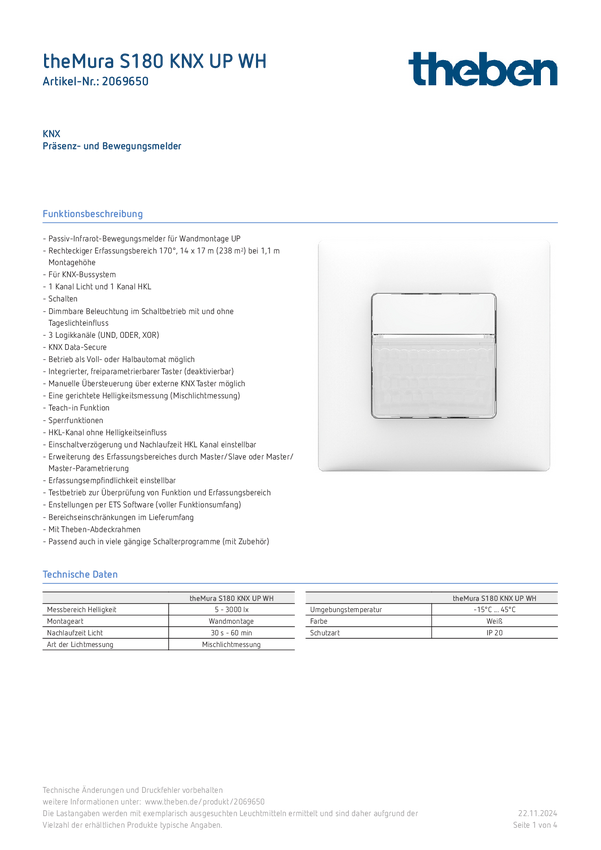 2069650 Detektor ruchu Theben 2069650 theMura S180 KNX UP WH