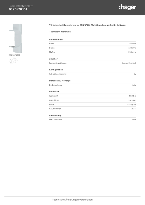 Trójnik (rozgałęźnik T) Hager BRHN, T-stuk voor goot 70x130 mm, halogeenvrij, lichtgrijs G125670351, 1 szt.