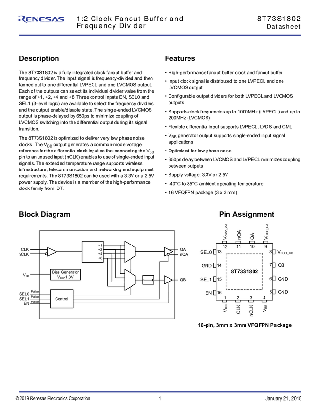 8T73S1802NLGI8 1:2 Clock Fanout Buffer and Frequency Divider