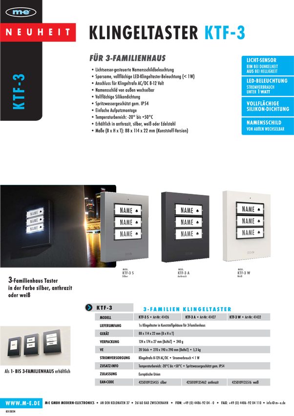 41432 Przycisk do dzwonka m-e modern-electronics KTF-3 W, IP54, biały