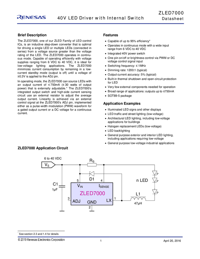 ZLED7000ZI1R 40V LED Driver with Internal Switch