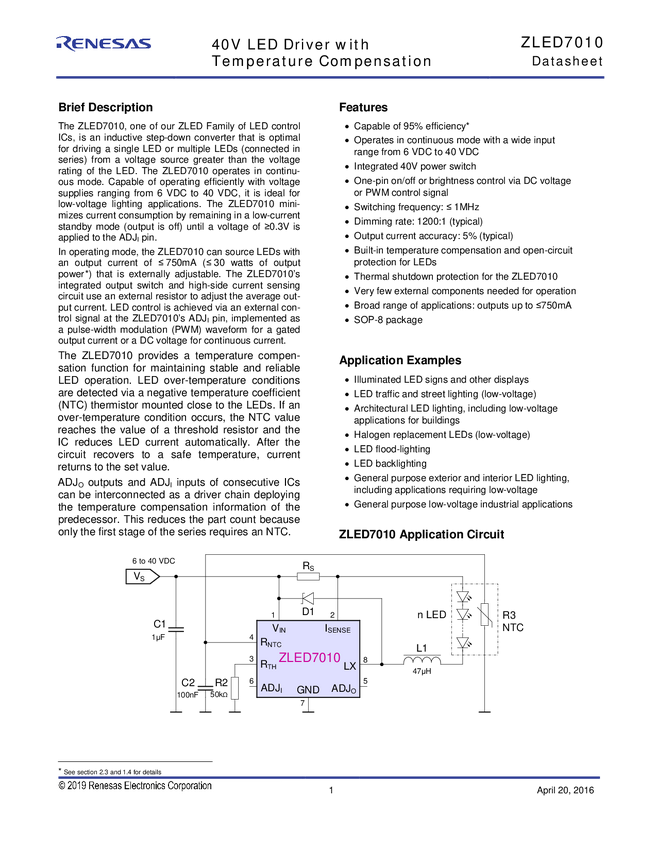 ZLED7010ZI1R 40V LED Driver with Temperature Compensation