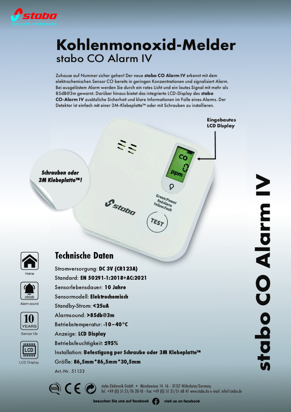 51133 Stabo CO-Alarm IV Czujnik czadu bateryjne Wykrywanie Tlenek węgla