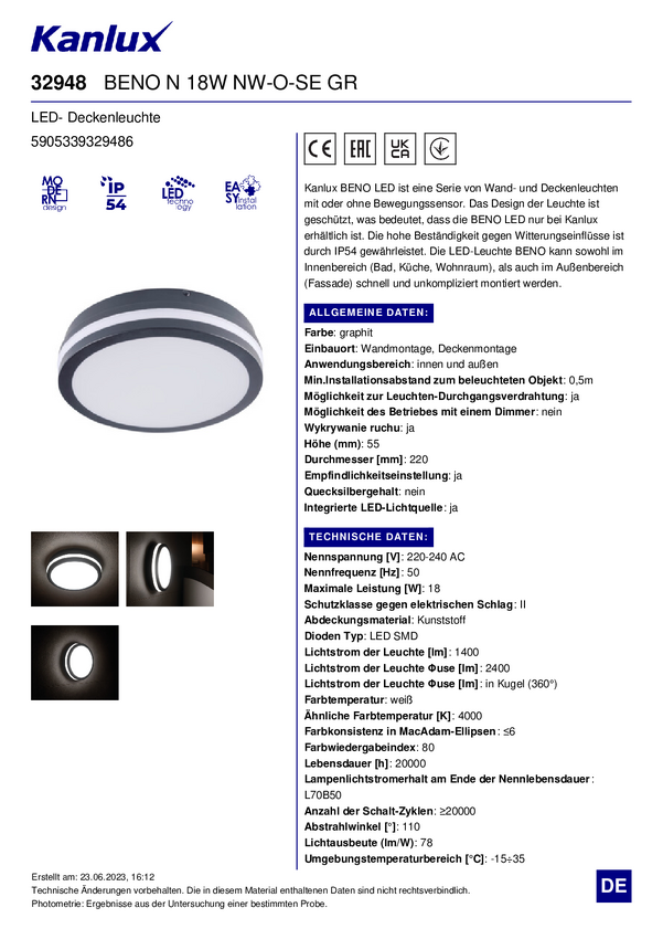 32948 Lampa sufitowa LED, Lampa ścienna LED Kanlux BENO 32948 18 W 1400.00 lm cza...