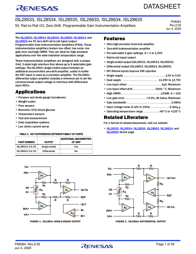 ISL28534FVZ 5V, Rail-Rail I/O, Zero-Drift, Single Ended Output Programmable Gain Instru...