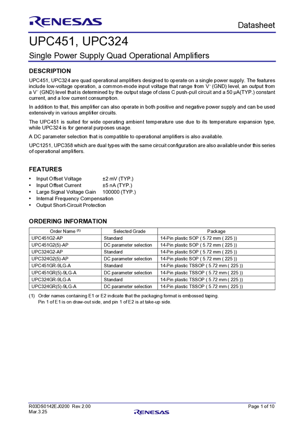 UPC451GR-9LG-E1-A Single Power Supply Quad Operational Amplifiers