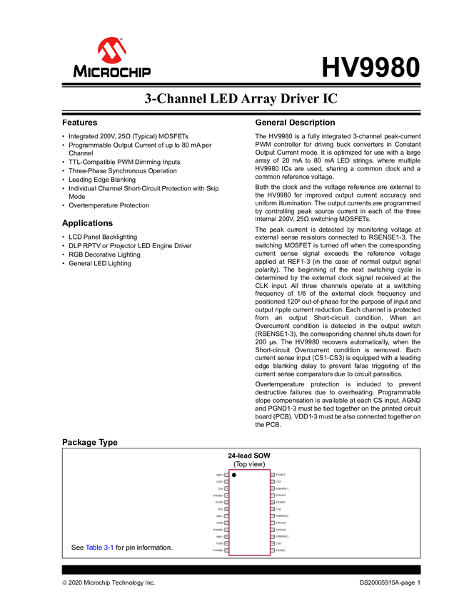 HV9980 3-Channel LED Array Driver IC Data Sheet