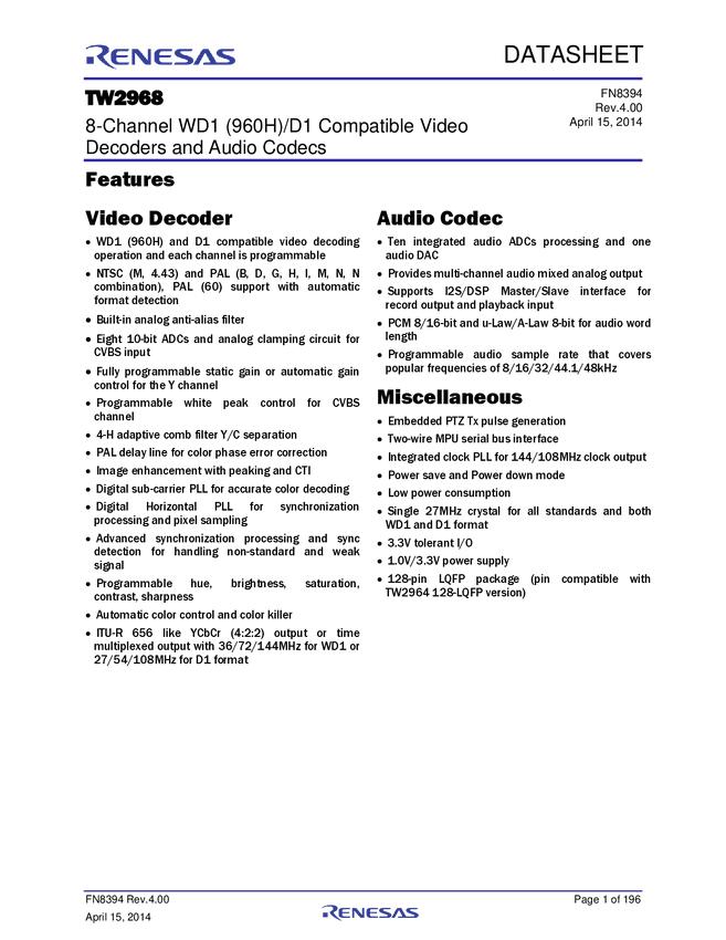 TW2968-LA1-CR 8-Channel WD1 (960H)/D1 Compatible Video Decoders and Audio Codecs