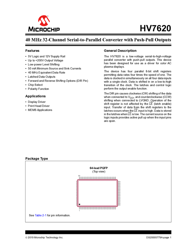 HV7620 40 MHz 32-Channel Serial-to-Parallel Converter with Push-Pull Outputs