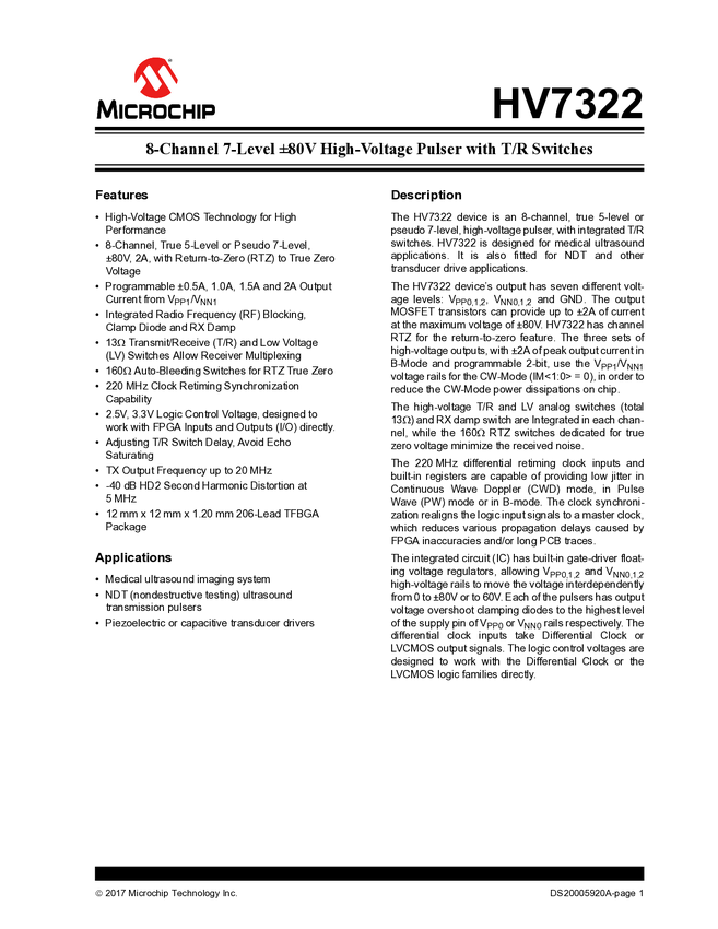 HV7322 8-Channel 7-Level ±80V High Voltage Pulser with T/R Switches