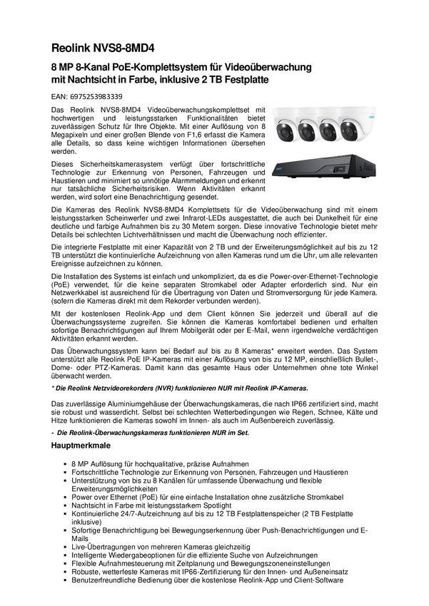 Reolink NVS8-8MD4 LAN IP-Zestaw monitorujący 8-kanałowy z 4 kamerami 3840 x 2160 px