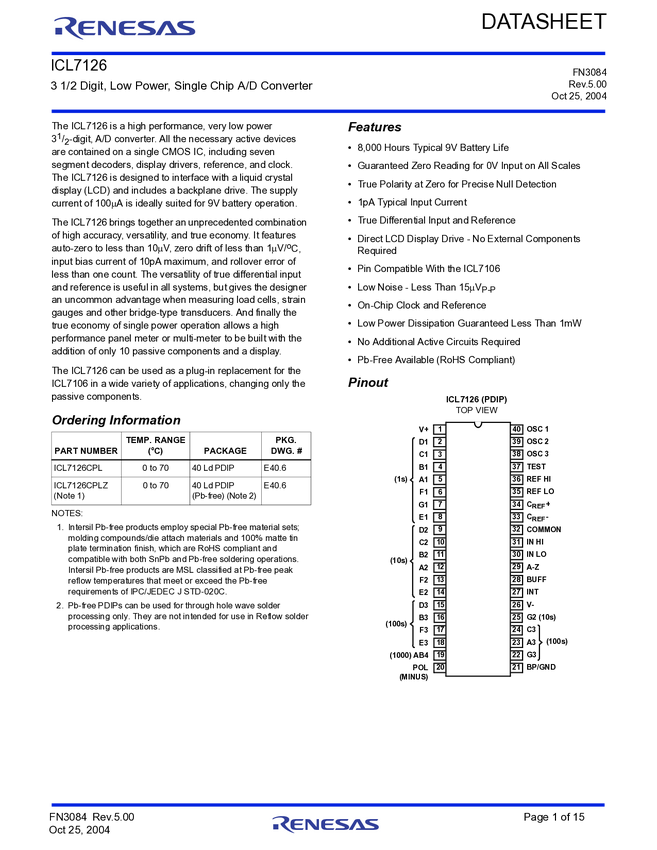 ICL7126CPLZ 3 1/2 Digit, Low Power, Single-Chip A/D Converter