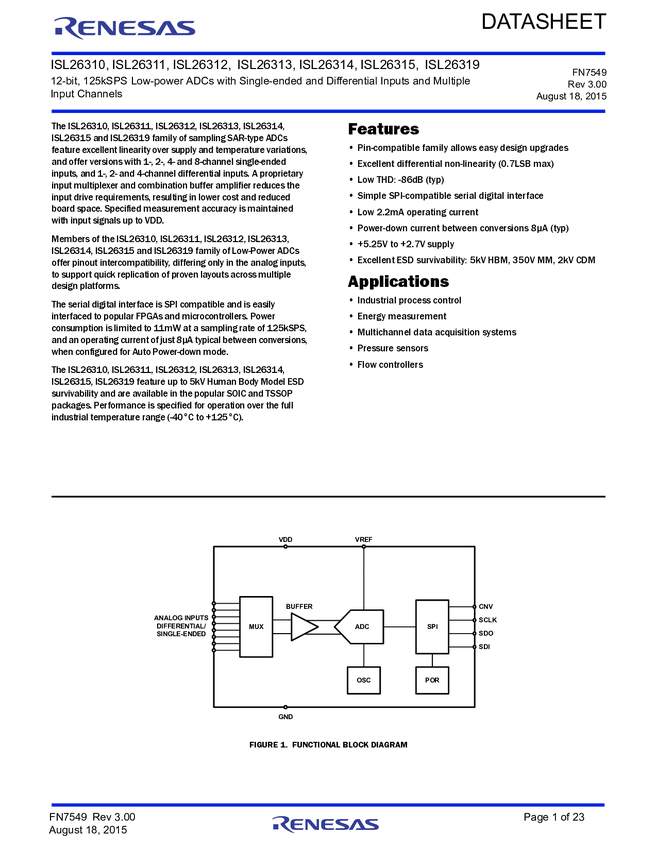ISL26312FVZ 12-bit, 125kSPS Low-power ADCs with Single-ended and Differential Inputs an...