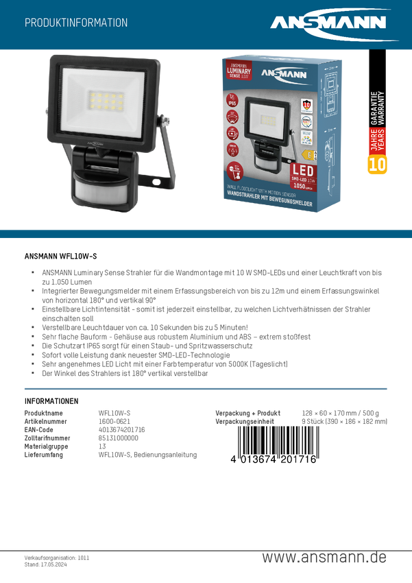 Lampa ścienna Ansmann WFL10W-S 1600-0621 10 W 1050 lm IP65