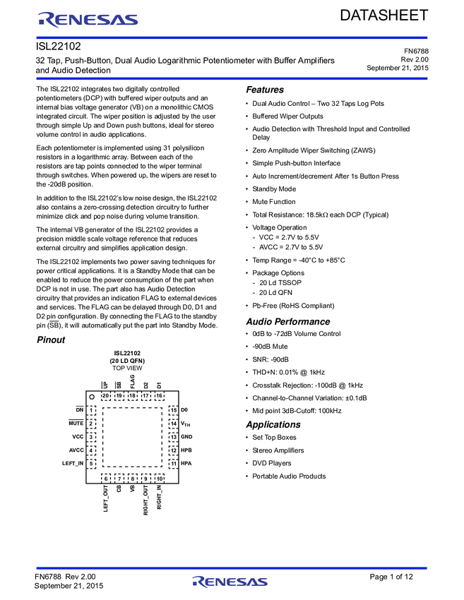 ISL22102IR20Z Dual, Audio, Push-button Controlled Potentiometer (XDCP™) 32 Tap, Push-butt...