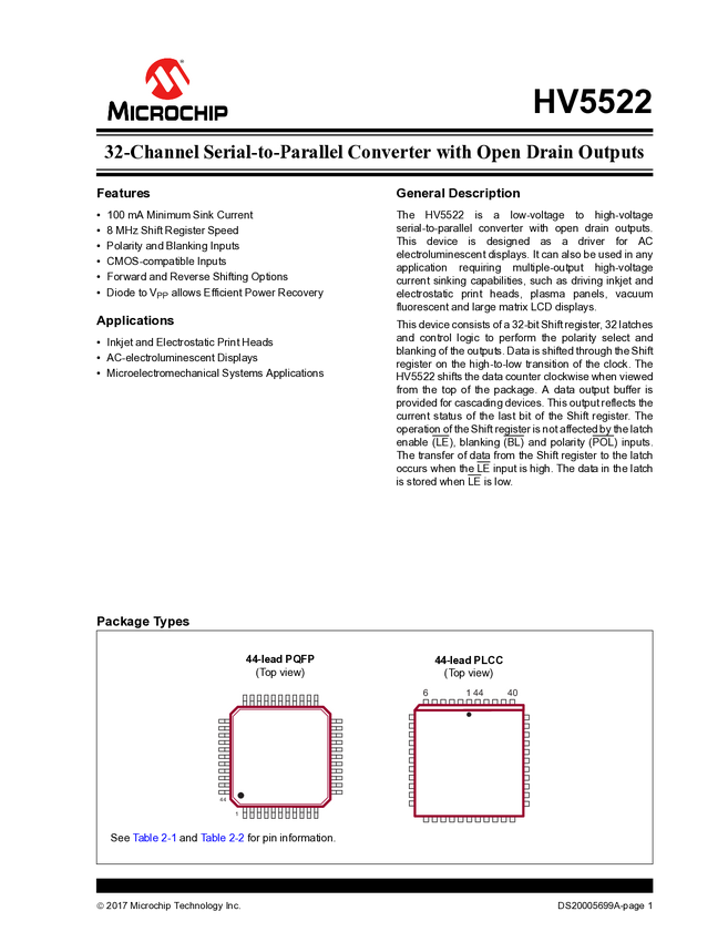 HV5522 32-Channel Serial-to-Parallel Converter with Open Drain Outputs Data Shee