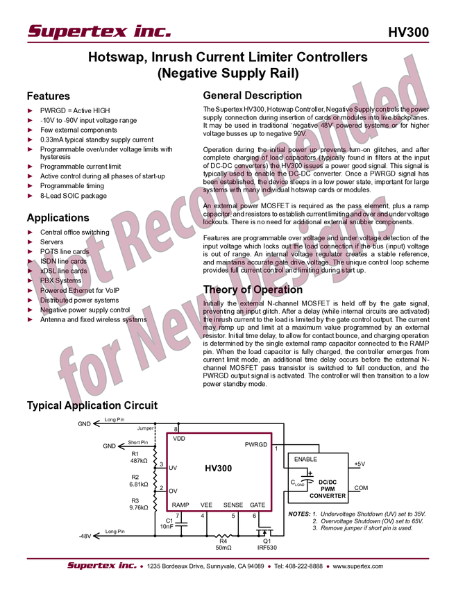 HV300 - Hotswap, Inrush Current Limiter Controllers (Negative Supply Rail)