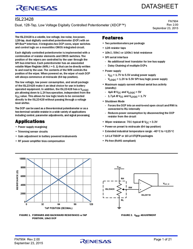 ISL23428TFRUZ-TK, ISL23428TFVZ, ISL23428TFVZ-T7A, ISL23428TFVZ-TK, ISL23428WFRUZ-T7A, ISL23428WFRUZ-TK, ISL23428WFVZ, ISL23428WFVZ-T7A, ISL23428WFVZ-TK, ISL23428