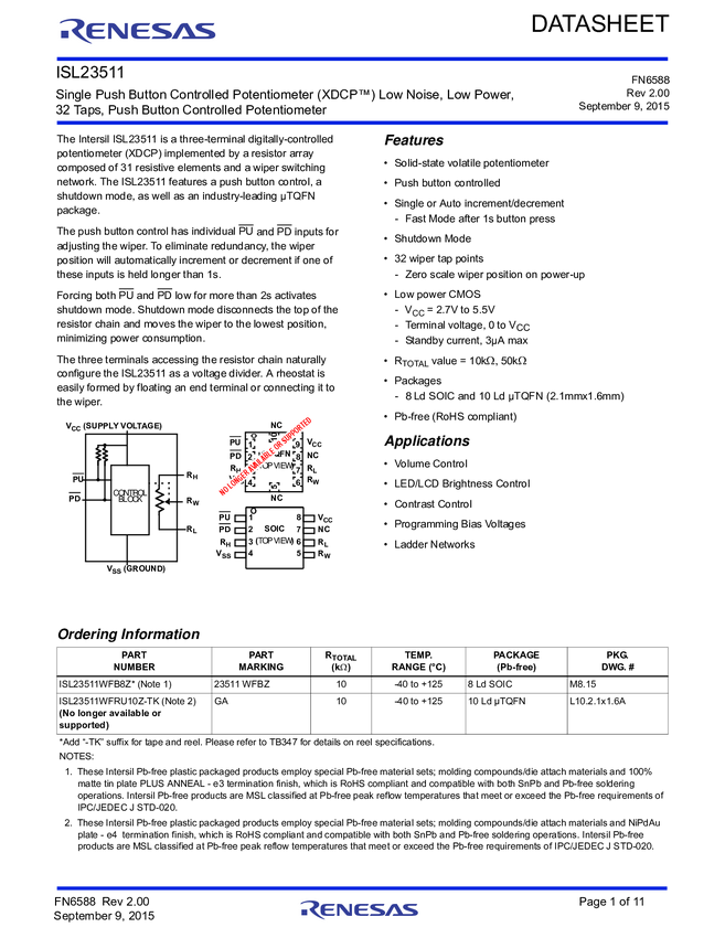 ISL23511WFB8Z Low Noise, Low Power, 32 Taps, Push Button Controlled Potentiometer
