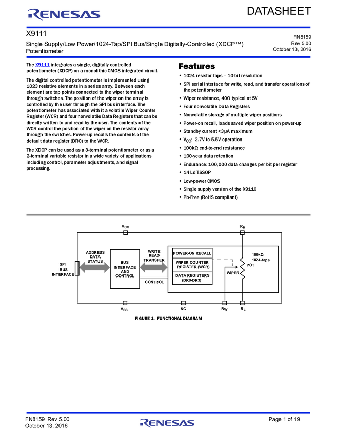 X9111TV14IZ Single Digitally Controlled (XDCP™) Potentiometer