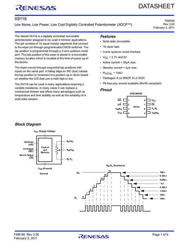 X9116WM8IZ Digitally Controlled Potentiometer (XDCP™)