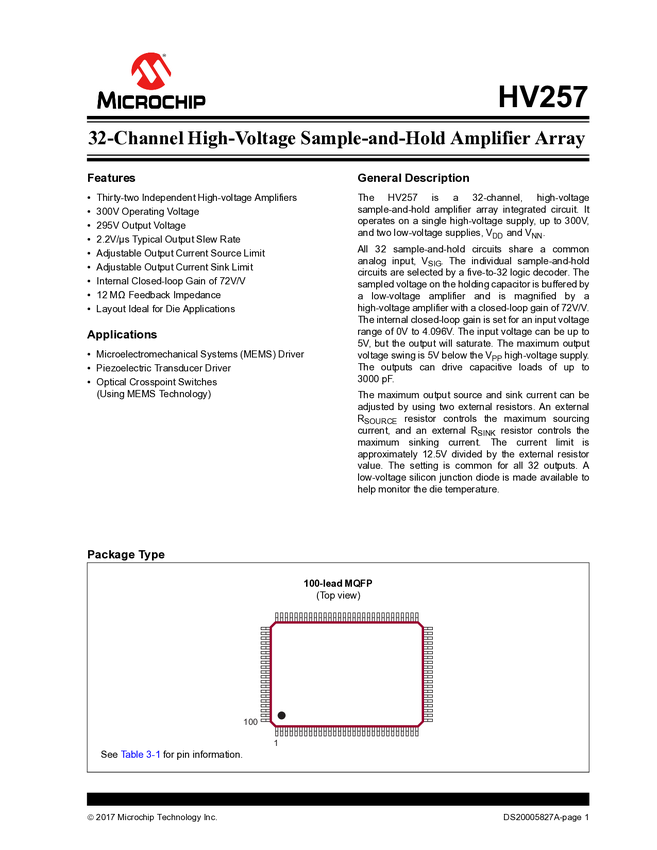 HV257 32-Channel High-Voltage Sample-and-Hold Amplifier Array Data Sheet