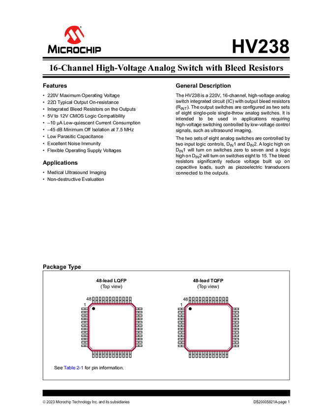 HV238 16-Channel High-Voltage Analog Switch with Bleed Resistors Data Sheet