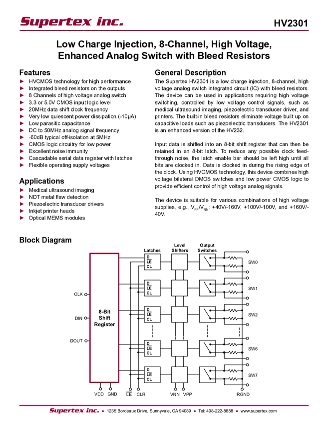 HV2301 - Low Charge Inj., 8-ch HV, Enhanced Analog Switch /w Bleed Resistors