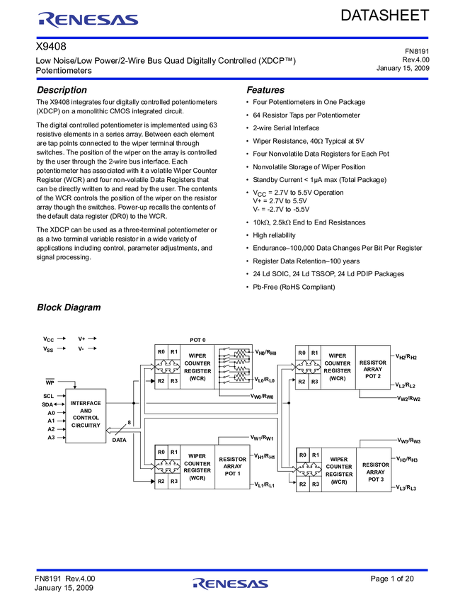 X9408WS24IZ-2.7 Quad Digitally Controlled (XDCP™) Potentiometers