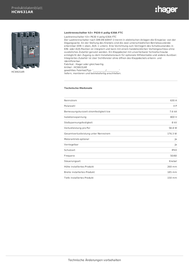 HCW631AR Hager HCW631AR Przełącznik rozłączający 4 styki 630 A 690 V
