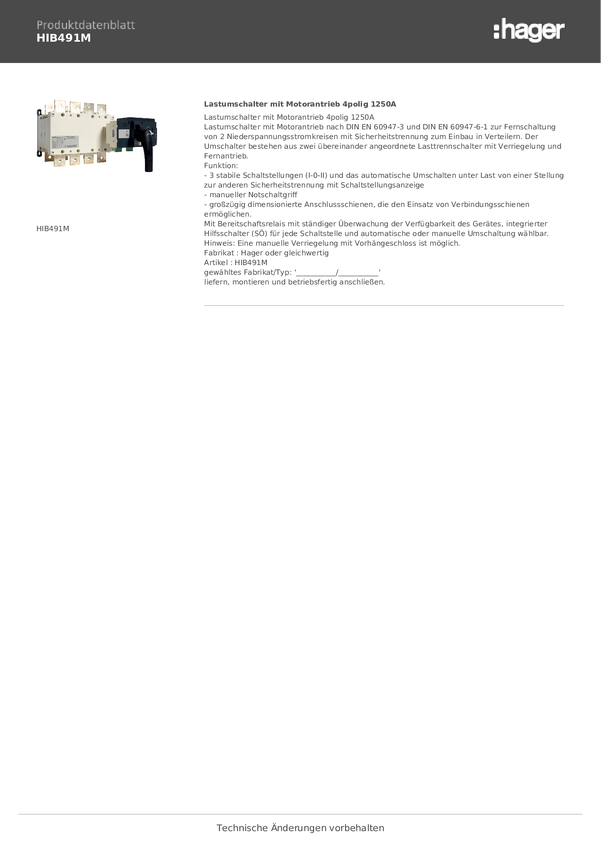 HIB491M Przełącznik zasilania Hager HIB491M, 4 styki, 415 V, 1250 A