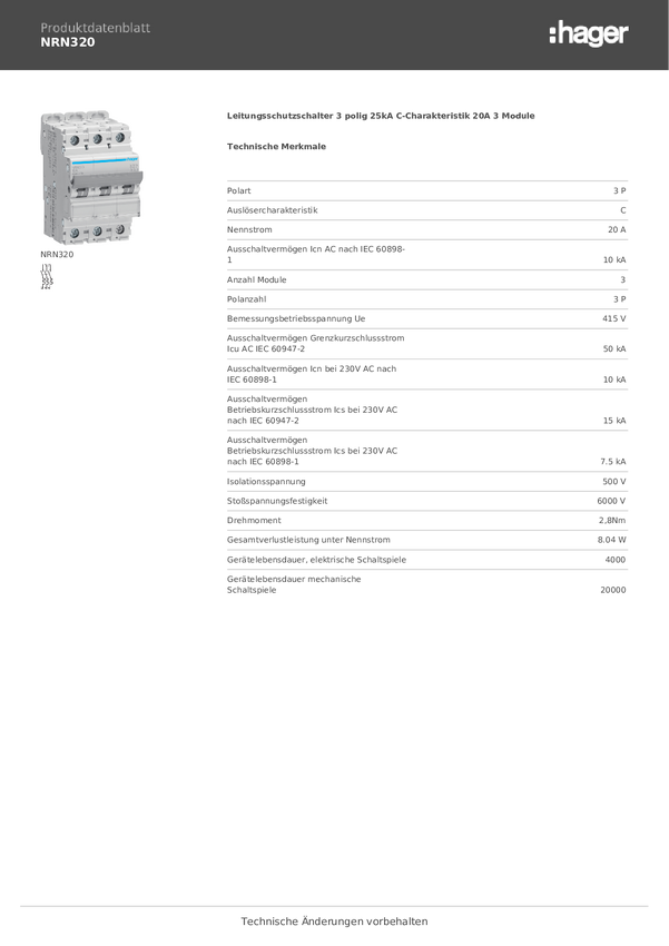 NRN320 Hager NRN320 Wyłącznik automatyczny 3 styki 20 A 415 V