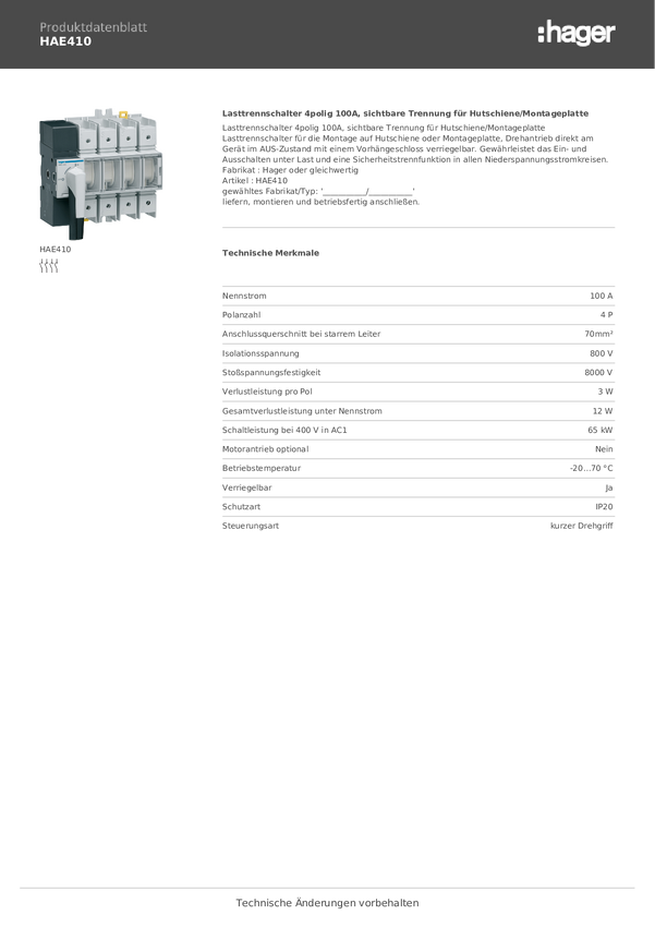 Hager HAE410 Przełącznik rozłączający 4 styki 100 A 415 V