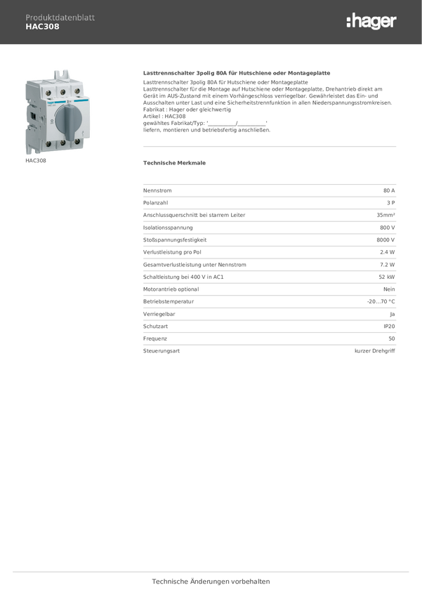 HAC308 Hager HAC308 Przełącznik rozłączający 3 styki 80 A 415 V