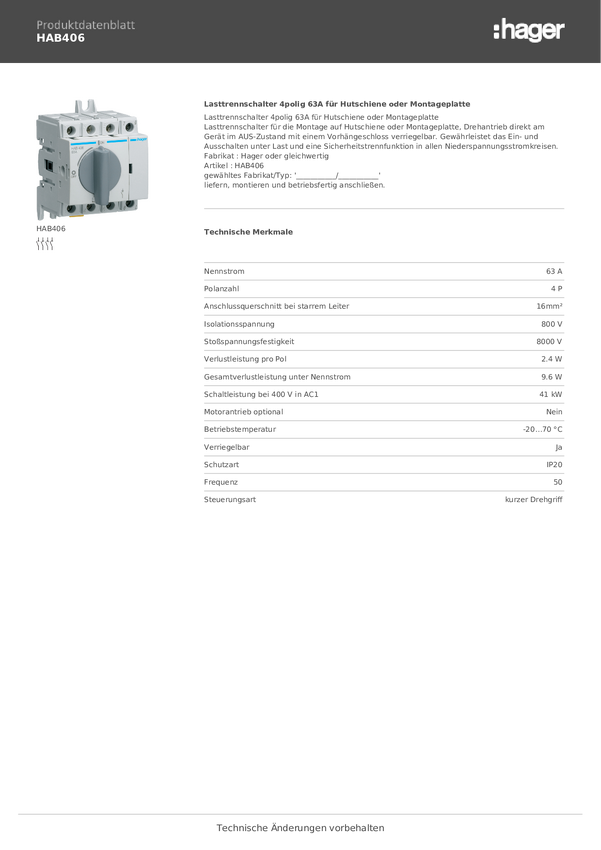 HAB406 Przełącznik rozłączający Hager HAB406, 4 styki, 415 V, 63 A