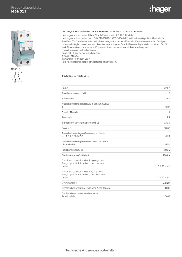 MBN513 Wyłącznik automatyczny Hager MBN513, 2 styki, 230 V, 13 A