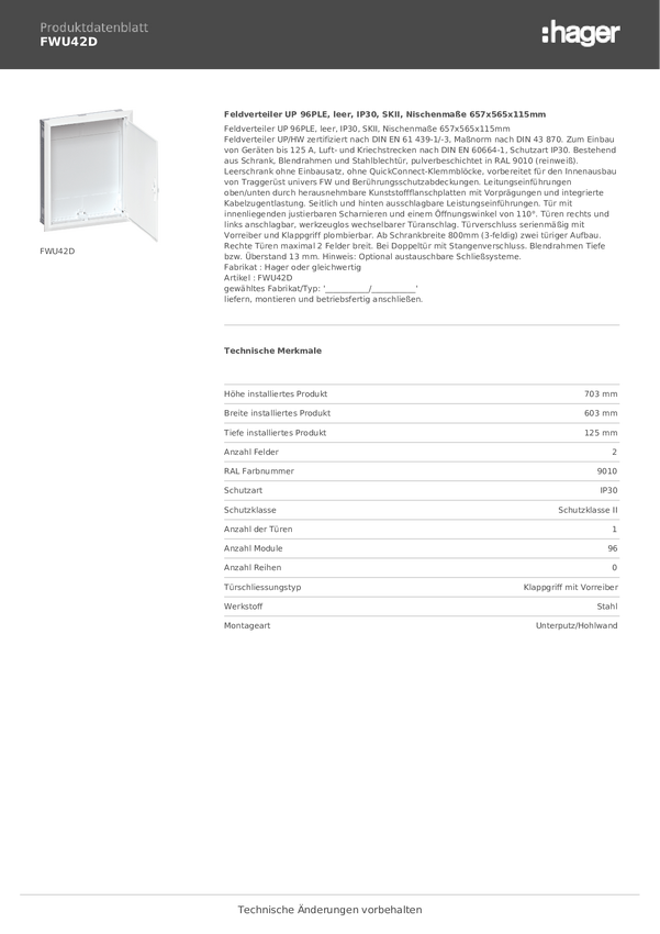 FWU42D Rozdzielnica Hager FWU42D, 603 mm x 703 mm x 125 mm, 1 szt.