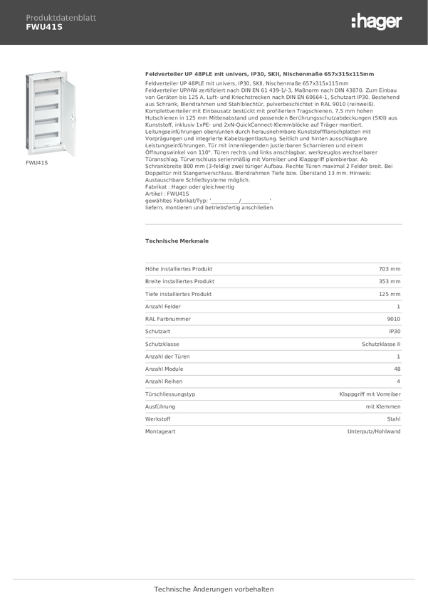 FWU41S Hager FWU41S Rozdzielnica ścianki drążone Ilość rzędów = 4 Content 1 szt.