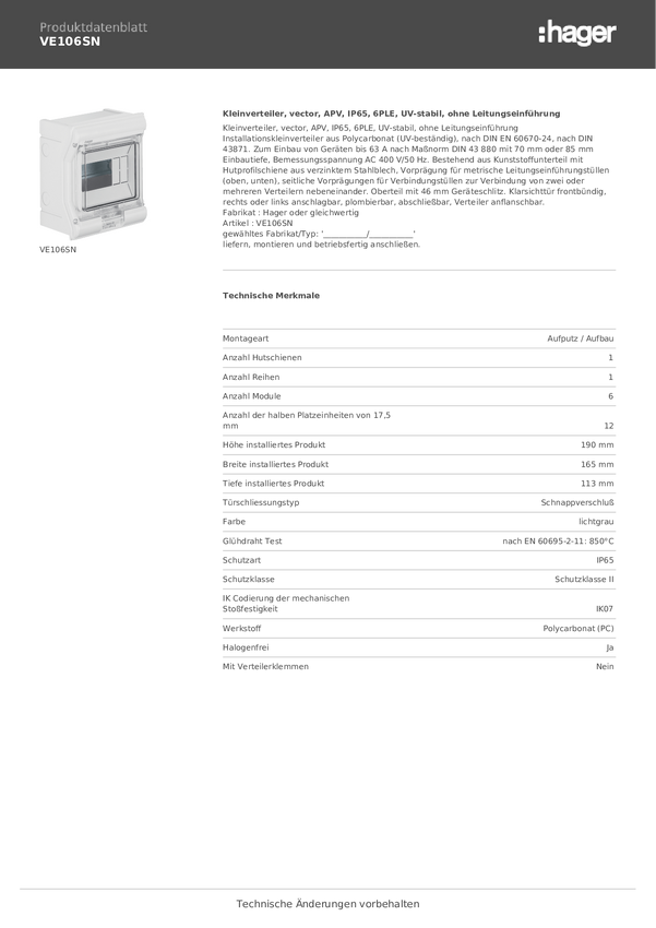 VE106SN Hager VE106SN Rozdzielnica mała nadtynkowy Ilość rzędów = 1 Content 1 szt.