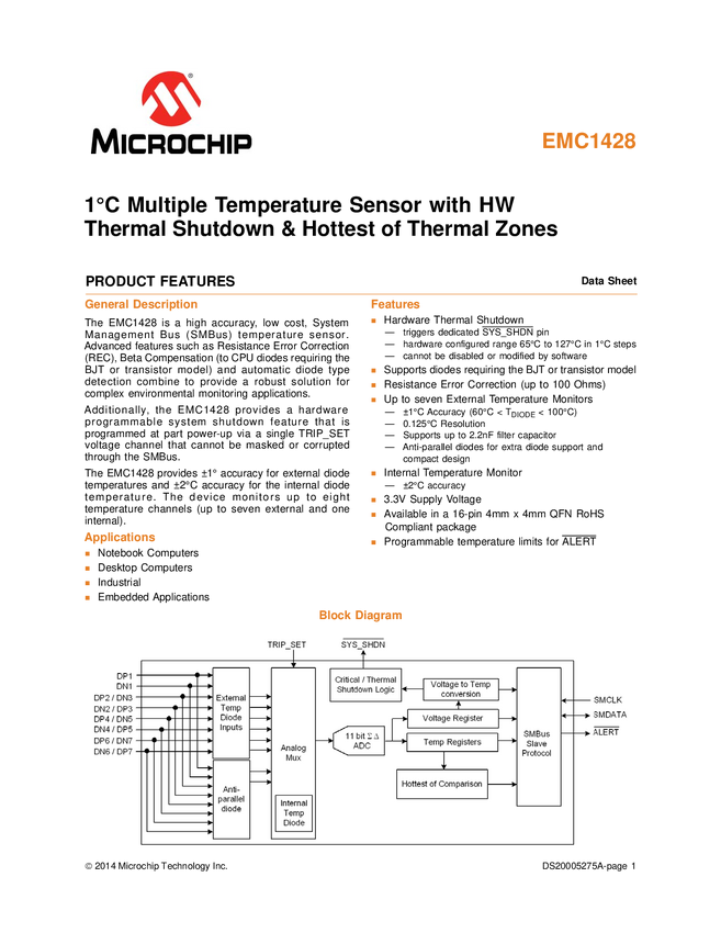 EMC1428 1C Multiple Temperature Sensor with HW Thermal Shutdown & Hottest of