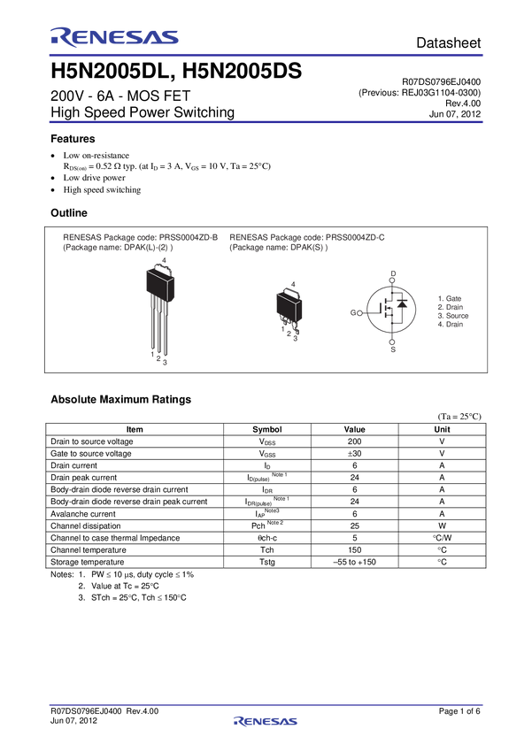 H5N2005DSTL-E Nch Single Power Mosfet 200V 6A 650Mohm DPAK(S)/To-252