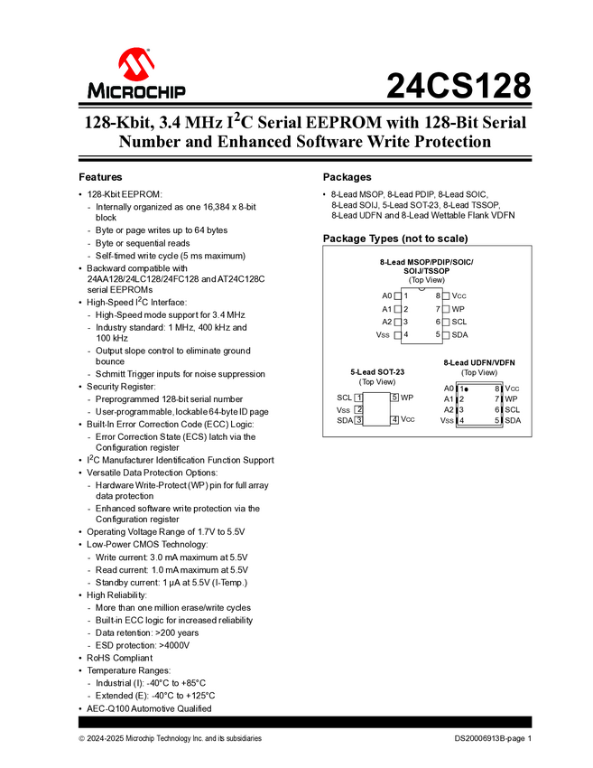 24CS128 128-Kbit, 3.4 MHz I2C Serial EEPROM with 128-Bit Serial Number and Enhanced...